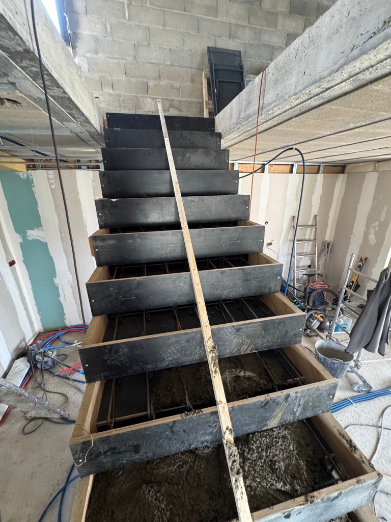 Réalisation d’un escalier en béton armé, conçu sur mesure par coffrage traditionnel.